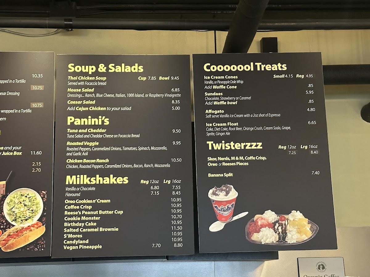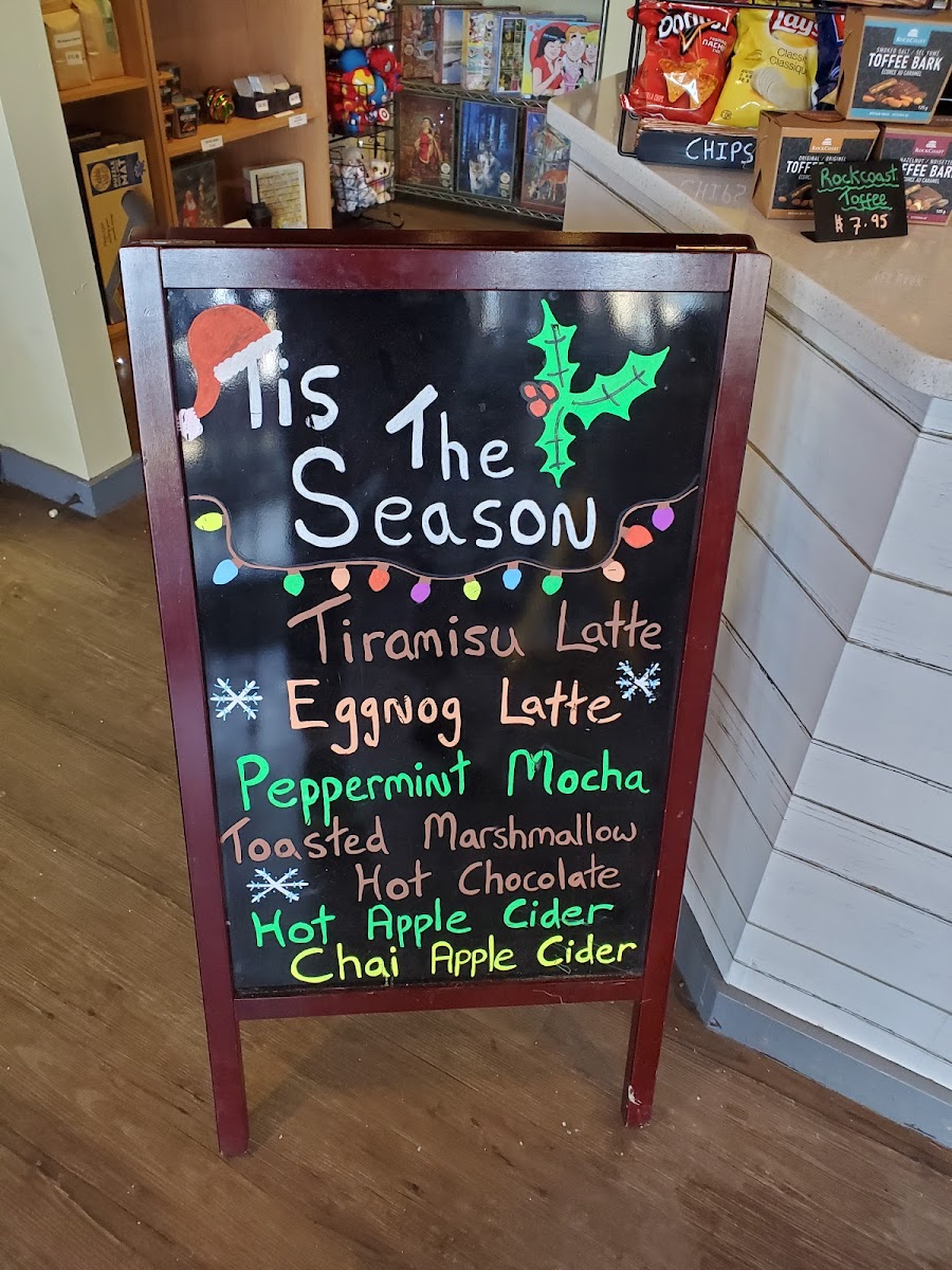 - Baked Goods: A range of cookies including chocolate chip, double chocolate, peanut butter, and white chocolate macadamia, with a gluten-free option available at an additional charge. Other baked goods include scones (cheese & chive, cranberry, pumpkin), apple strudel, chocolate chip banana mini loaf, large cinnamon buns with cream cheese icing, and chocolate brownies.