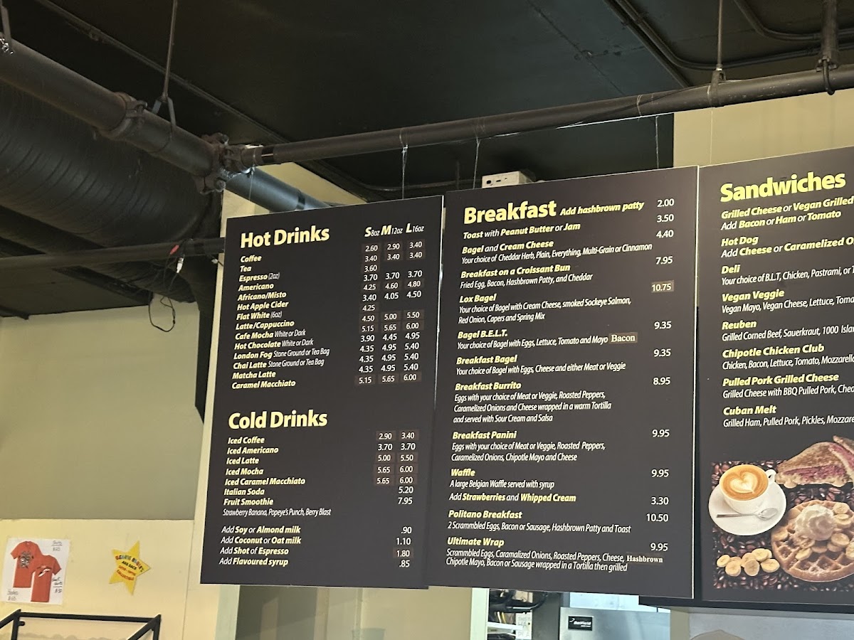 The menu at Politano Cafe is structured to accommodate a range of dining preferences, focusing primarily on breakfast items, baked goods, and a variety of hot beverages. It offers options suitable for a morning meal, light lunch, or casual coffee break.