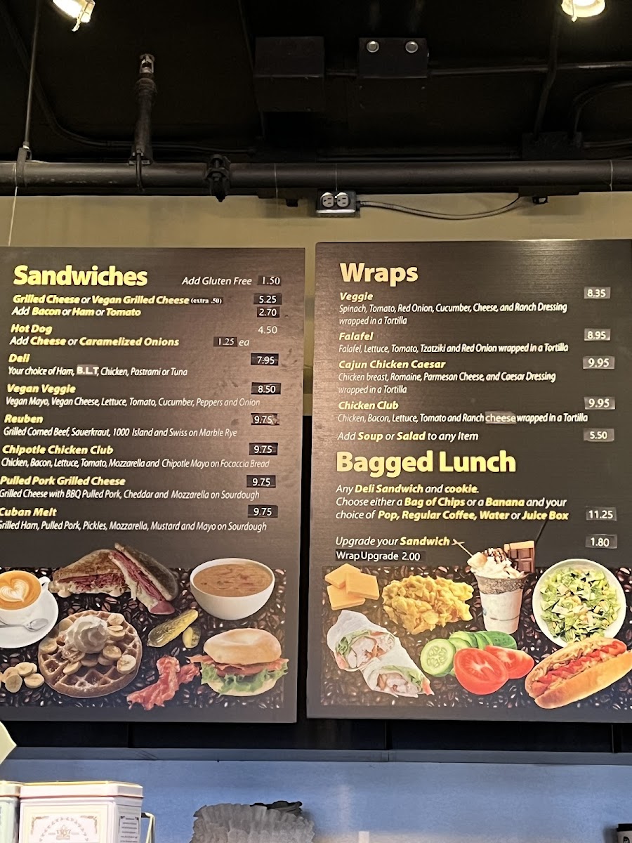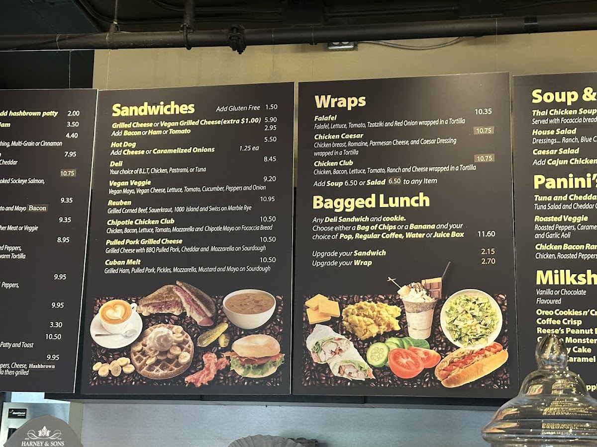 - Food - Breakfast: Items designed for breakfast or brunch such as breakfast sandwiches (egg, ham, and cheddar on an English muffin), veggie breakfast bagels with eggs and roasted vegetables, toast, breakfast paninis with eggs and a choice of bacon, ham, or sausage, and an ultimate wrap featuring scrambled eggs and a meat choice. These options provide a combination of protein, vegetables, and bread suitable for a morning or midday meal.